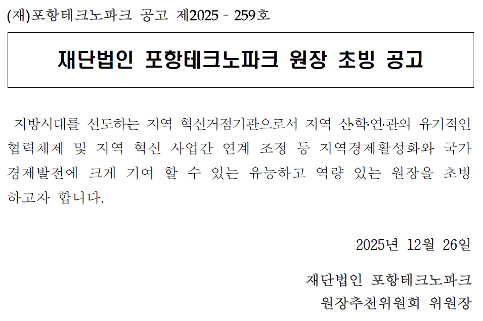 (재)포항테크노파크 원장 초빙 공고