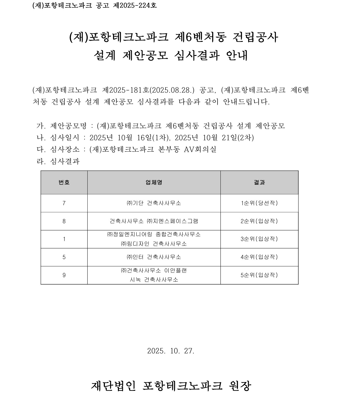 '(재)포항테크노파크 제6벤처동 건립공사 설계 제안공모' 심사결과 안내