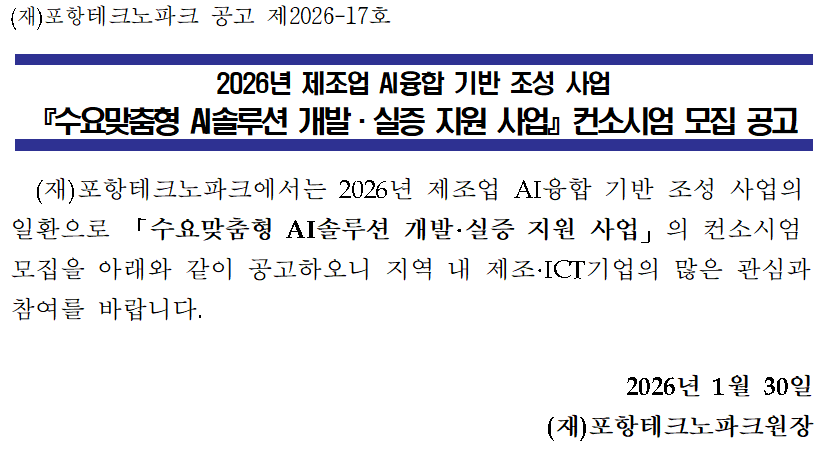 2026년 제조업AI융합기반조성사업 AI솔루션 개발·실증 지원사업(수요맞춤형) 모집공고