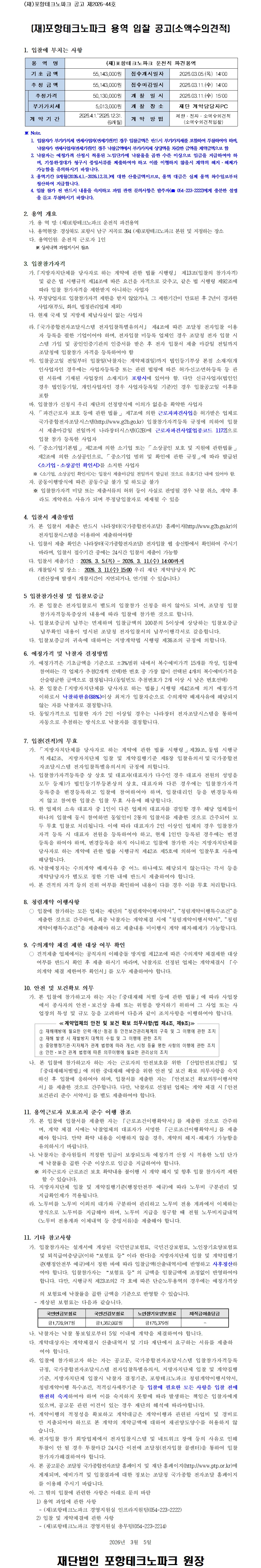 '(재)포항테크노파크 운전직 파견용역' 입찰 공고(소액수의견적)