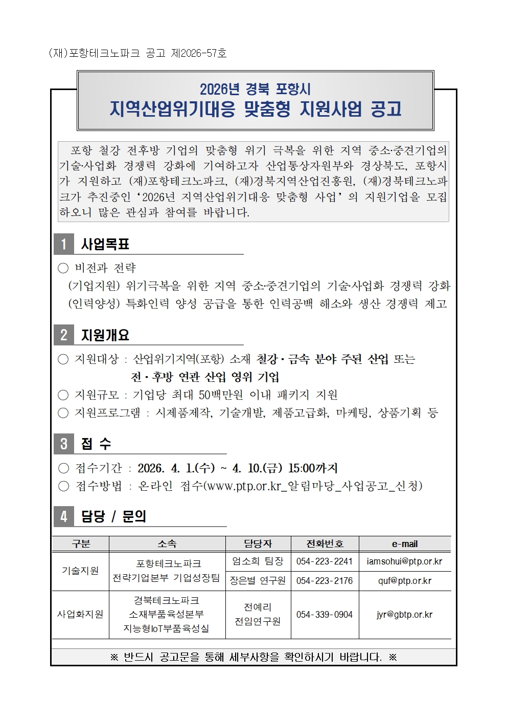 2026년 경북 포항시 지역산업위기대응 맞춤형 지원사업 지원기업 모집 공고