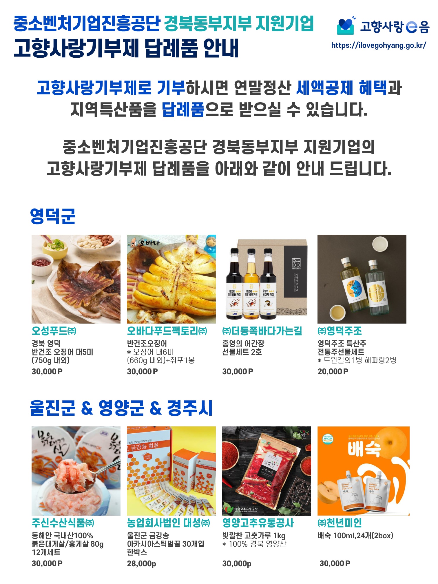 [중소벤처기업진흥공단] 경북동부지부 지원기업 고향사랑기부제 답례품 안내
