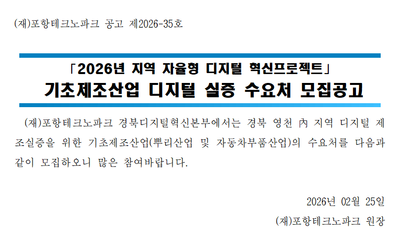 2026년 지역 자율형 디지털 혁신프로젝트(영천)「기초제조산업 디지털 실증」수요처 모집